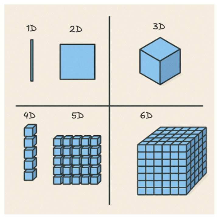 One more way to think about this is to use the cube analogy: a line is 1D, a plane is 2D, a cube is 3D, a stacked cube is 4D, a plane of stacked cubes is 5D, and a cube of stacked cubes is 6D.