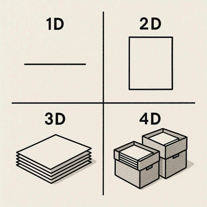 In this image, 1D is a line on paper, 2D is a single sheet of paper, 3D is many sheets of paper, and 4D is multiple sheets of paper in the boxes.