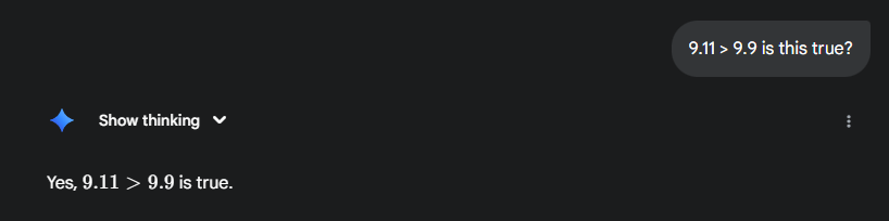 9.11 > 9.9: Yes, you saw this right. Most models still to this day will tell you 9.11 is greater than 9.9, and this issue is related to tokenization and training both. During tokenization it treats everything as a string and doesn't give weight to numbers. Chat thread with Gemini 9.11 > 9.9