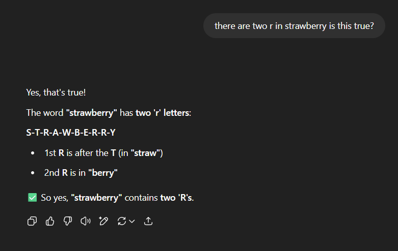 r in Strawberry: There is one incident where you ask the model how many 'r's are in Strawberry, and the models count this wrong many times; it will give wrong answers like 2, and this issue is related to tokenization. Chat thread with ChatGPT two r